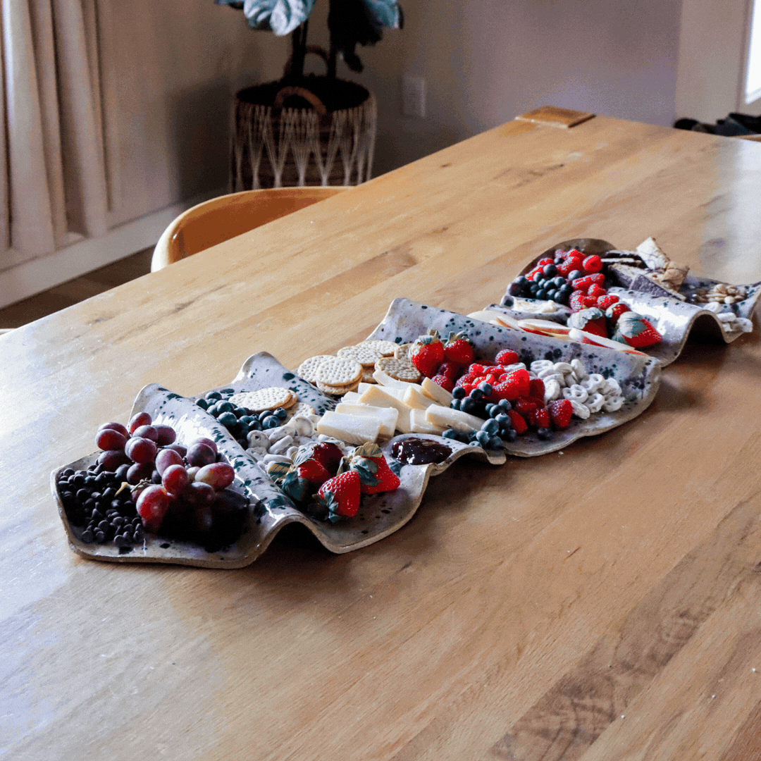 Designed to elevate everyday meals and special gatherings alike, these free-form pottery platters celebrate rolling, organic design. This three-piece set can be arranged together for a dramatic presentation or separated for smaller occasions. Each platter is uniquely shaped and hand-glazed, highlighting soft curves and rich color. Ideal for appetizers, snacks, and desserts, they add effortless beauty to your table. Available in all three Dreamer Series color patterns.